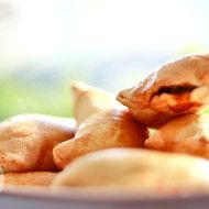 - Ciasto drożdżowe podziel na 3 części. Jedną z nich rozwałkuj na podsypanej mąką stolnicy (na grubość ok. 0,5 cm). Dużą szklanką wytnij krążki, faszeruj jedną łyżką grzybów i zaklej jak zwyczajne pierogi.