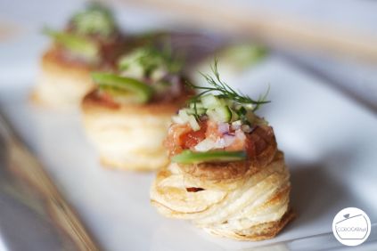 - Koszyczki z ciasta francuskiego wypełnij tatarem z łososia i udekoruj przygotowanymi warzywami.