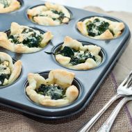 - Kwadraty powkładaj w otwory w formie na muffinki, wystawiając rogi ciasta na zewnątrz. Do środka nałóż farsz szpinakowy z fetą.
