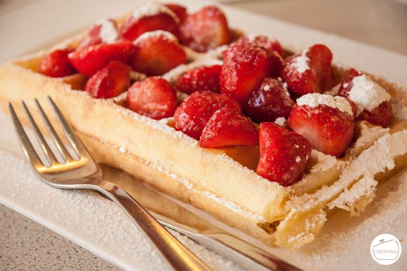 - Upieczone gofry przełóż na talerz i podawaj z ulubionymi dodatkami. Moje gofry podałam z cukrem pudrem i karmelizowanymi owocami.