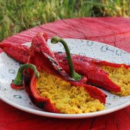 - Do środka papryki włóż doprawioną kaszę i zamknij delikatnie obkrojonym ogonkiem.
