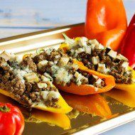 - Do przekrojonych połówek papryki nałóż porcje mięsa z bakłażanem. Na nim poukładaj połówki pomidorków oraz ser pleśniowy.