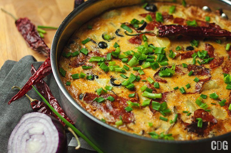- Na patelni, na której będziesz przygotowywać tortillę, wytop plasterki chorizo. Następnie przełóż je do dużej miski.